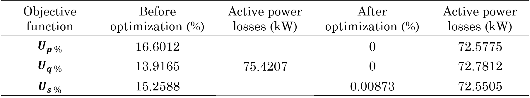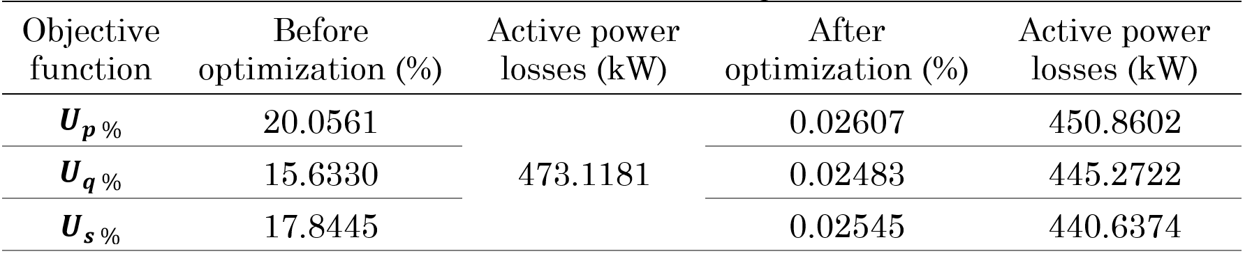 In all cases, minimizing the indices Up %, Uq % and Us % allows for reducing the expected power losses value with respect to the initial case. The power losses are reduced by about 4.7045 % when the active power imbalance is minimized. This reduction is about 5.8856 % for the reactive power imbalance and 6.8652 % for the average apparent power imbalance.