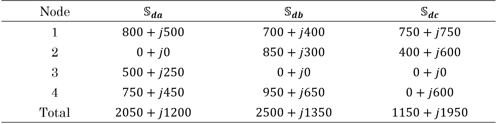 Which, for the example in Table 1 takes a value of Sp = 1900 + j1500 Here, F is the set containing all the phases, i.e., F ={a,b,c}.