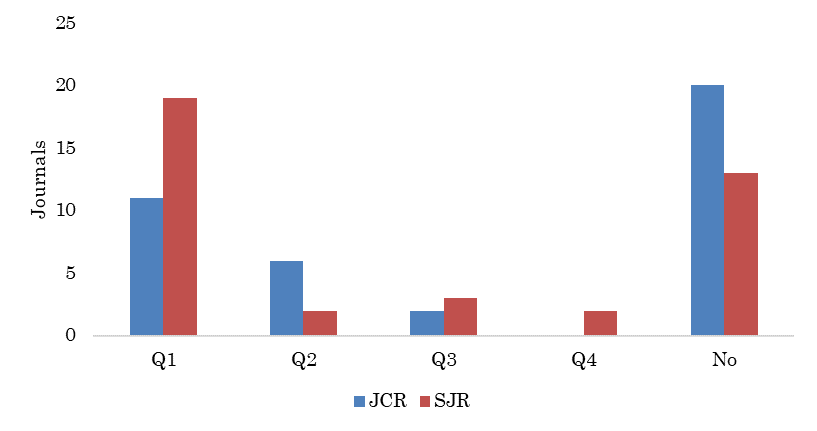 Figure 8 summarizes the quartiles assigned to the journals in which the articles were published. A total of 40 different journals were identified, of which 47.5 % have been classified in a JCR quartile and 65 % have been classified with the SJR indicator.