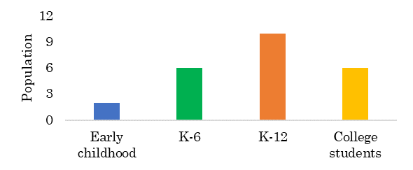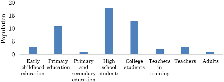 In terms of study population, 25 % of the papers focused on college students, 3.8 % on teachers in training, 35 % on high school students, 21 % on primary students, and 6% on early childhood education. Among these publications, 5.7 % are about teachers. Figure 10 presents the frequency of each type of study population.