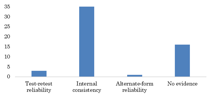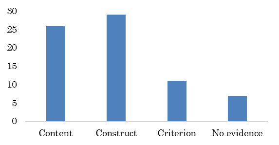 It was found that 87 % of the instruments showed evidence of validity; and 69 %, evidence of reliability. Figures 11 and 12 display the types of validity and reliability reported in the articles.