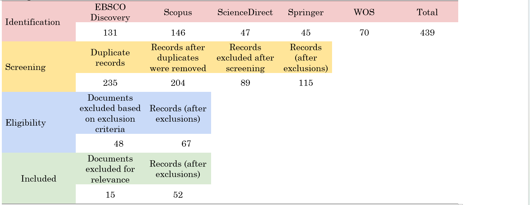 Initially, the search yielded 439 articles. After removing duplicates, 204 articles remained. Following further screening for relevance, 115 articles were retained. Finally, by applying exclusion criteria, a total of 52 articles were selected for the systematic review. Figure 3 provides a summary of the articles identified at each stage of the search process, which was conducted following the PRISMA statement.