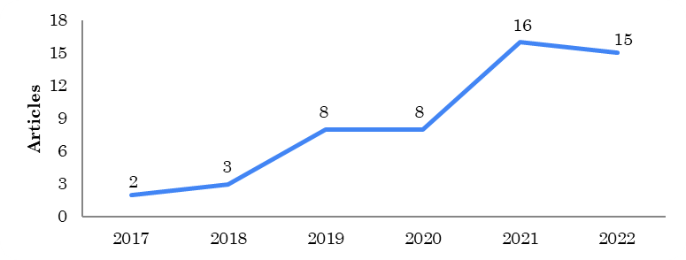 As mentioned earlier, the search spanned from 2012 to 2022. Remarkably, none of the five sources yielded publications related to instrument construction before 2017. Figure 5 depicts the increase in the number of publications dedicated to CT measurement instruments throughout the analyzed period.