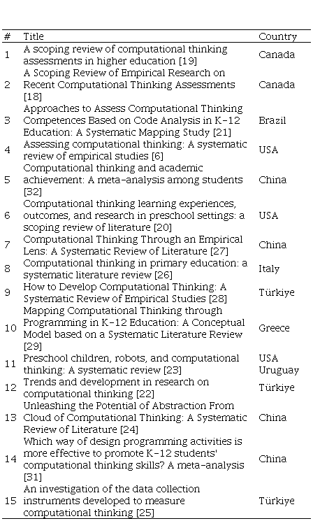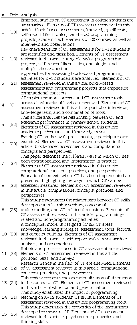 In their systematic review [6], evaluated 96 articles, considering variables such as educational level, subject matter domain, educational setting, and assessment tool. The findings emphasized the need for more assessments targeting high school students, college students, and teachers, in addition to evidence of the validity and reliability of the instruments. [25], for their part, analyzed 64 studies on CT measurement, identifying the psychometric properties of instruments primarily aimed at determining levels and measuring skills.