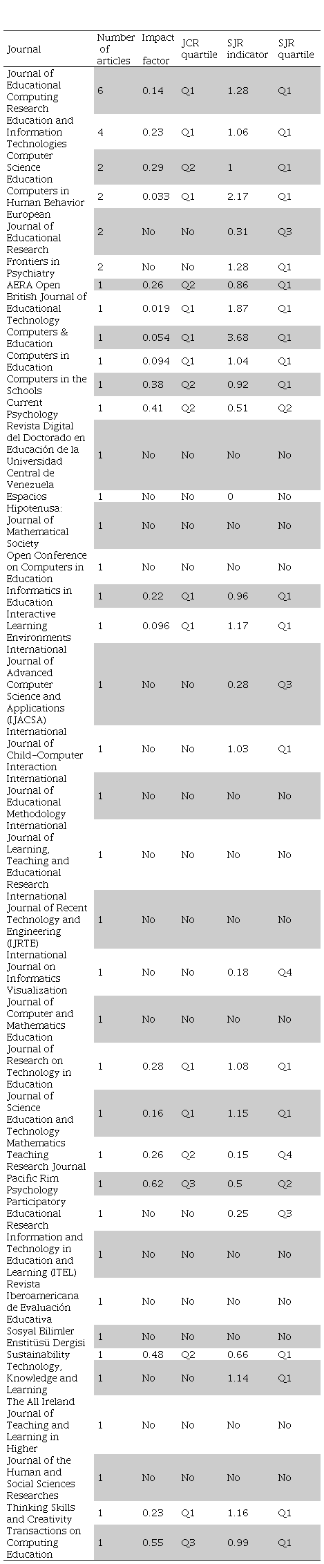 In the analysis, two impact indicators evaluating the excellence of published content were employed. JCR, on the one hand, primarily focuses on citation counts, providing the impact factor and quartile of a journal. SJR, on the other hand, considers the quality, relative importance of citations, and quartile of a journal. According to the findings, the Journal of Educational Computing Research and Education and Information Technologies stood out as the most productive journals, with six and four publications, respectively. Regarding the two indices and quartiles, 21 % of the journals had no classification in any of the indices. Information on each journal is provided in Table 3.The most prominent journals, ranked by the number of CT-related publications, are listed in [22] .