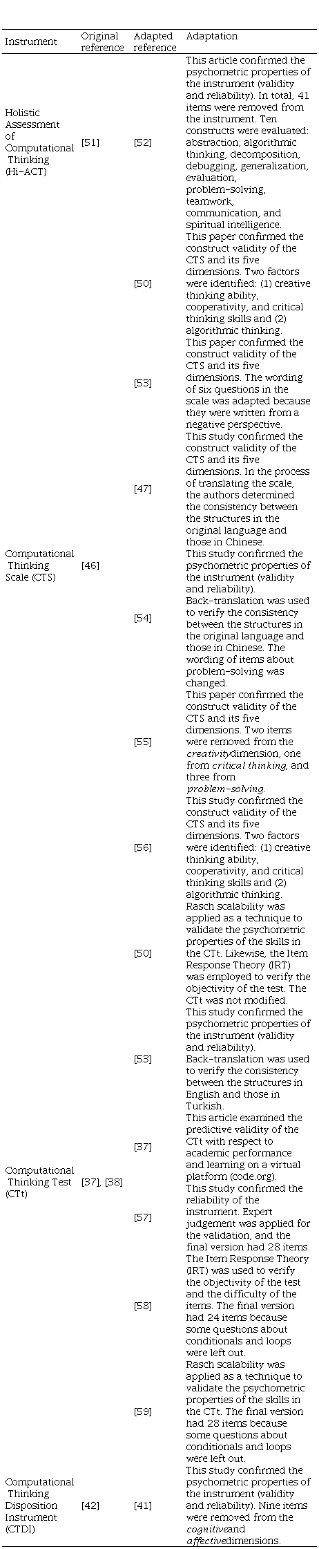 The psychometric properties of the instruments were studied from the perspectives of validity and reliability. Of the instruments assessed, 86 % demonstrated validity and 69 %, reliability. Content and construct validity were predominant. Regarding reliability, internal consistency was the most commonly used criterion in the selected studies. All articles that adapted CTS presented evidence of its psychometric properties. Among those in which the CTt was adapted, only one did not provide evidence of validity. These results differ from those reported in [6] , where the authors noted that an important number of CT assessments lacked evidence of reliability and validity.