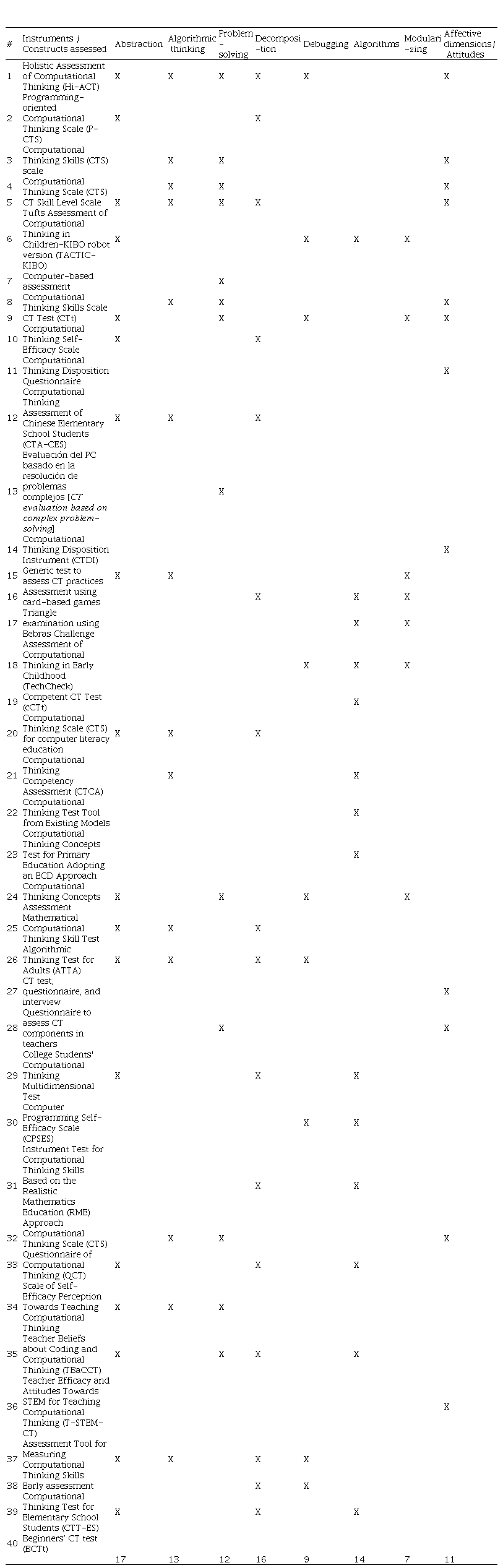 Abstract: Computational Thinking (CT) is considered a key literacy skill in the digital age. It encompasses problem-solving, mathematical thinking, critical thinking, creativity, and communication. Since research on CT evaluation is in a consolidation phase, there is still a lack of systematic grouping of assessment instruments across different educational levels. This review aimed to identify the instruments used to measure CT, the evaluated skills, and the psychometric properties of these instruments. For such purpose, a systematic review of 52 articles published between 2012 and 2022 was conducted. The results revealed a significant growth in publications on the design and validation of CT measurement instruments in recent years. Over 80 % of the instruments demonstrated validity and reliability, particularly in terms of content validity, construct validity, and internal consistency. Furthermore, some instruments also evaluated affective and social skills, as well as attitudes, which enhanced the assessment of cognitive skills. However, the absence of contributions from Central and South American countries in the analyzed literature, along with the scarcity of instruments aimed at early childhood and teachers, highlights the need for further research into CT assessment in specific populations.