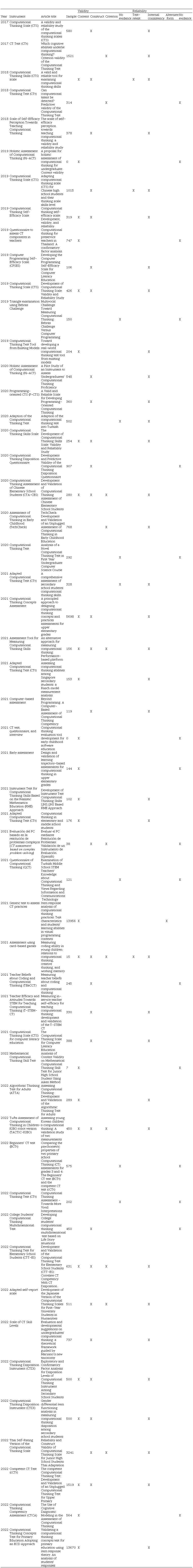 The selected studies propose 40 tools to measure CT in different formats (exam, instrument, questionnaire, test, assessment, scale, and evaluation)—with scales being the most common. Three articles included three ways to assess CT using complements to the instrument: (1) a web interactive application [48] , (2) tasks from Bebras cards combined with KIBO kits [65] , and (3) a game-based strategy [16] . The latter two were used to conduct research in early childhood education. This inventory of types, formats, constructs evaluated, number of items, and other information about the instruments can aid in making decisions for future research on CT measurement. It is worth noting that 2017 marked a milestone with the first publication of an instrument designed to assess CT. This differs from [66] perspective on the matter. It should be clarified that this information is based on a systematic literature review that did not identify any other instruments prior to that year.