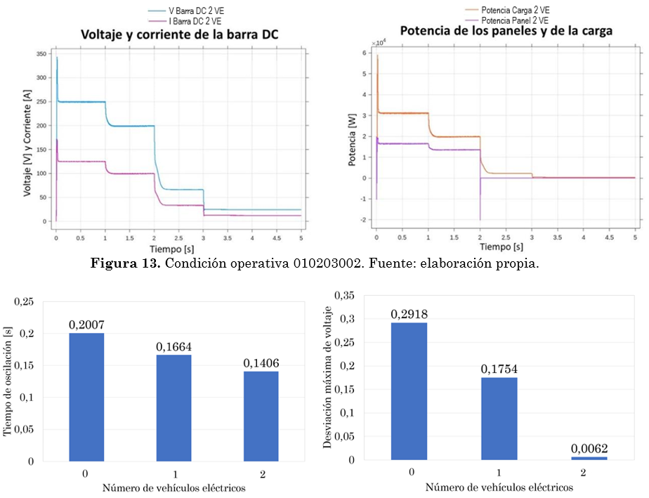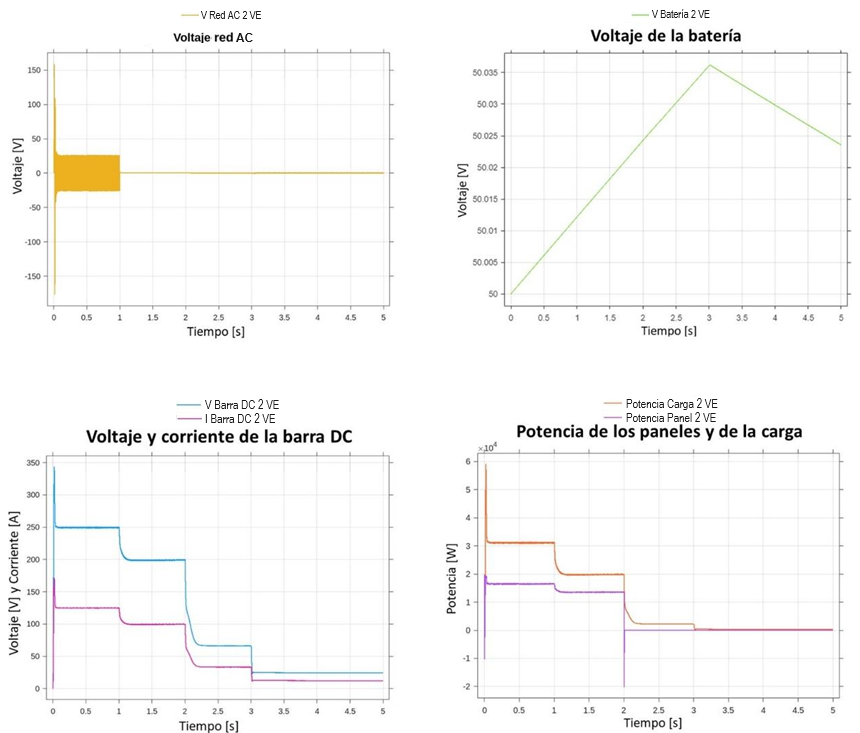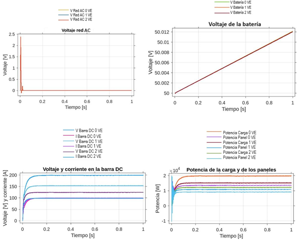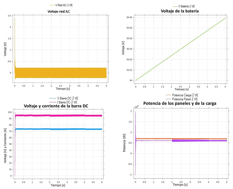 Al analizar estos resultados, se puede evidenciar que la microrred DC presenta problemas de operación cuando se cargan de manera simultánea los dos vehículos eléctricos. Para que la microrred opera de manera adecuada en condición de carga de vehículos eléctricos, la microrred debe estar conectada a la red externa.