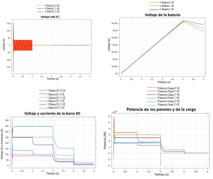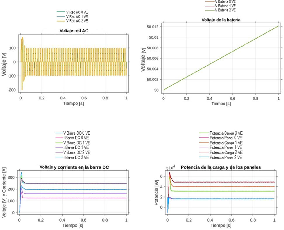 Se puede notar que a medida que ingresan vehículos al sistema el voltaje en la barra DC cae considerablemente. Por lo que en condiciones operativas donde se requiera cargar los vehículos, es necesario que la microrred esté conectada a la red externa. Estas caídas de voltaje pueden ocasionar daños o malos funcionamientos de algunos equipos de la microrred, por lo que es de vital importancia mantener constante el voltaje de esta barra. También se pudo evidenciar que es necesario tener al menos 2 elementos de generación activados para que la microrred pueda suplir cualquier escenario de carga. De lo contrario el sistema puede colapsar, ocasionando drásticas caídas de voltaje en la barra DC.