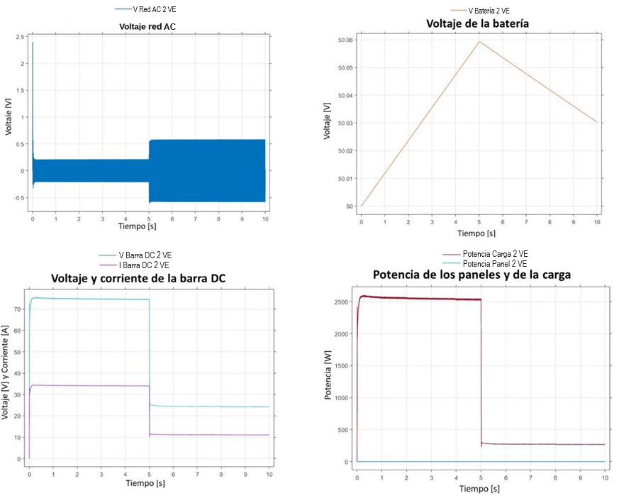 Los análisis de resultados indican que, para mantener la estabilidad del sistema frente a cambios de carga, es esencial mantener la red eléctrica siempre activa, ya que esta proporciona la potencia necesaria que la microrred no puede suministrar durante picos de alta demanda. Además, la red eléctrica juega un papel crucial en la estabilización del voltaje en la barra DC cuando las cargas aumentan. En consecuencia, para garantizar la estabilidad de la microrred en distintos escenarios operativos y niveles de carga, la interconexión con la red eléctrica resulta fundamental.