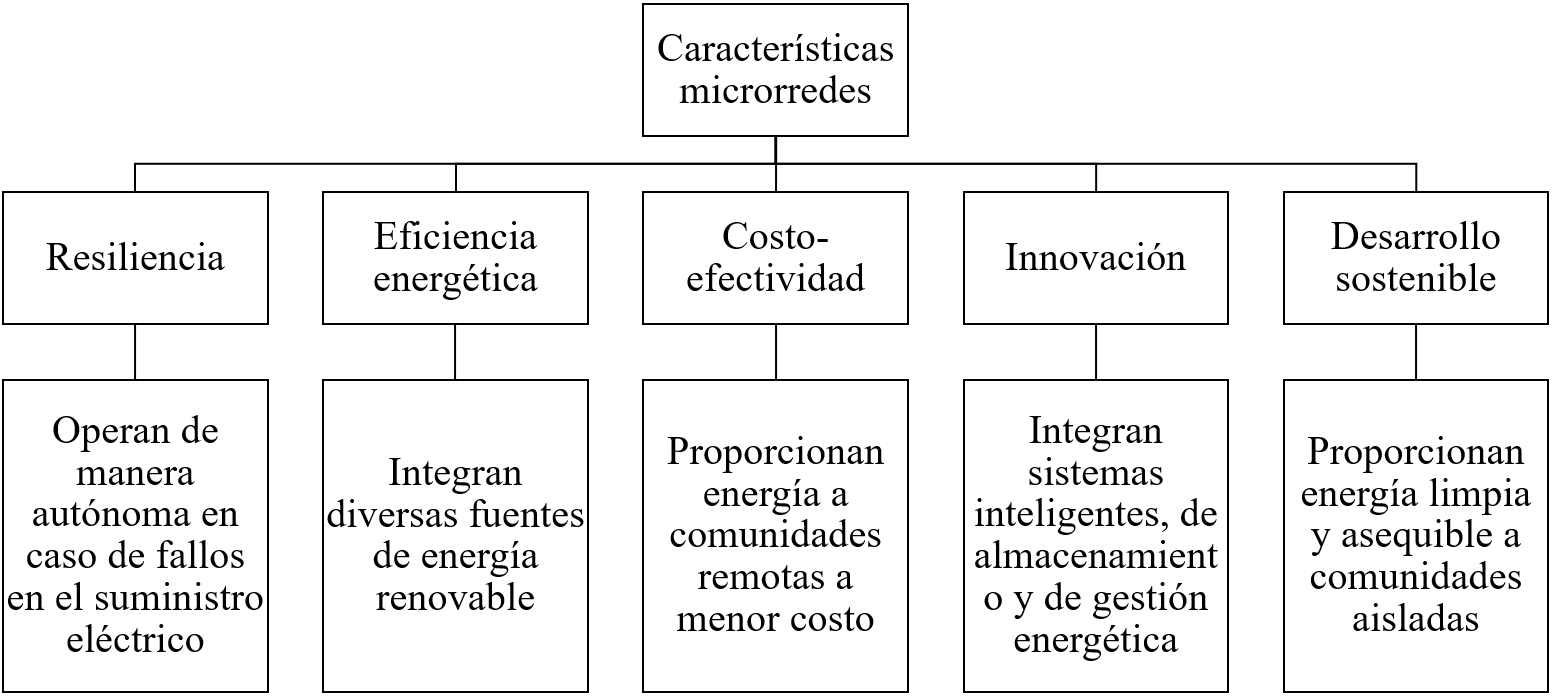 Las microrredes sirven como suministro de energía a un conjunto de usuarios residenciales ubicados dentro de una misma localidad, o también para industrias y empresas. Las microrredes pueden ser de tres tipos AC, DC o híbridas AC/DC [2]. Las microrredes en general presentan diferencias con respecto a las redes eléctricas tradicionales y son importantes por las características indicadas en la Figura 1.