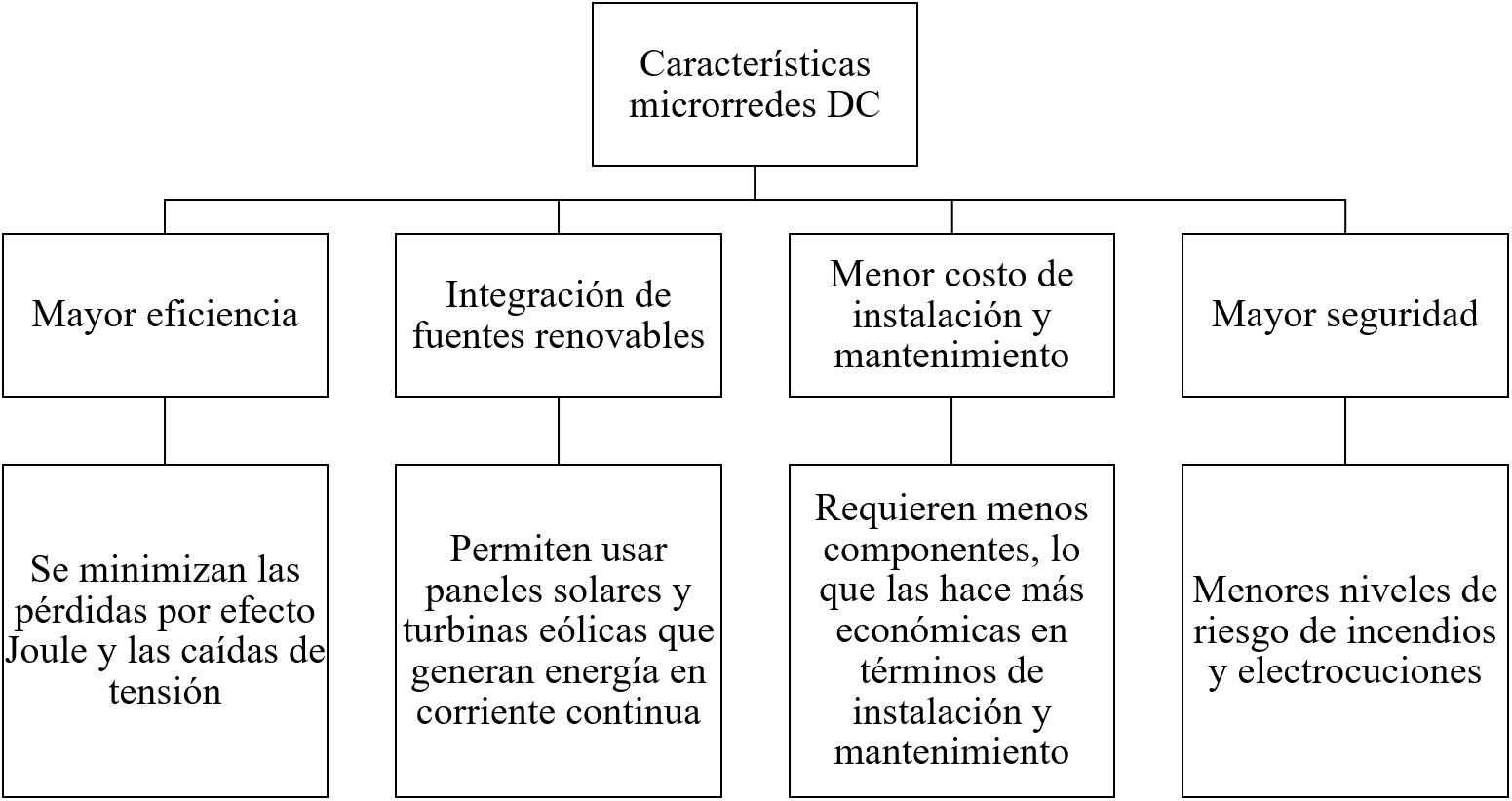 Por su parte, las microrredes DC son una solución innovadora en energía al reducir la necesidad de costosos convertidores y minimizar las pérdidas de energía asociadas a la conversión de corriente [2]. Al utilizar corriente continua desde la generación hasta la distribución, simplifican la infraestructura eléctrica, lo que conlleva ahorros y eficiencia al evitar las pérdidas que ocurren en las conversiones de corriente alterna a continua y viceversa [2]. Adicionalmente la mayoría de las cargas residenciales como iluminación led, televisores, cargadores de celulares, entre otros, emplean una tensión en DC para su funcionamiento. Sumado a esto se encuentra la creciente inmersión de los vehículos híbridos y eléctricos en los últimos años, debido a las necesidades de llevar a cabo un desarrollo sostenible, los avances tecnológicos e innovación industrial que les permiten ser más competitivos en el mercado [1]. También se debe considerar el apoyo gubernamental y la creciente conciencia pública sobre la importancia de la sostenibilidad. Las características más importantes de las microrredes DC se muestran en la Figura 2.