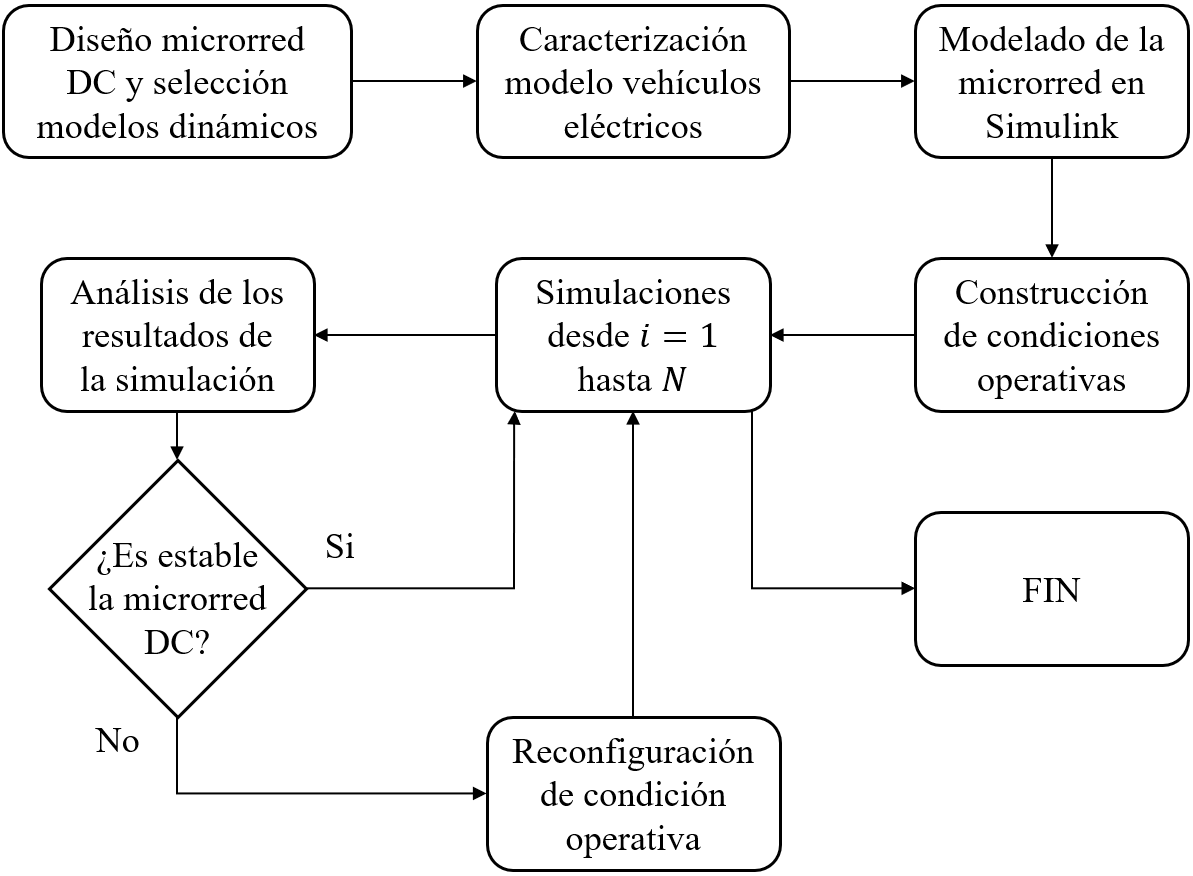 Posteriormente, se realizaron las simulaciones dinámicas necesarias para determinar la estabilidad de la microrred con la herramienta Matlab/Simulink, se consideró un tiempo de simulación de 10 segundos para cada condición operativa. En las simulaciones se utilizó el método numérico de integración de Runge Kutta de orden cuatro. Para estas simulaciones se tuvieron en cuenta tres escenarios de integración de vehículos eléctricos para evaluar el comportamiento dinámico de la microrred DC. A través de simulaciones realizadas en estos escenarios, se determinaron los casos bajo los cuales la microrred puede experimentar caídas drásticas de tensión. Finalmente, se realizó un análisis de los resultados obtenidos, identificando los casos críticos en los que la microrred pierde la estabilidad.