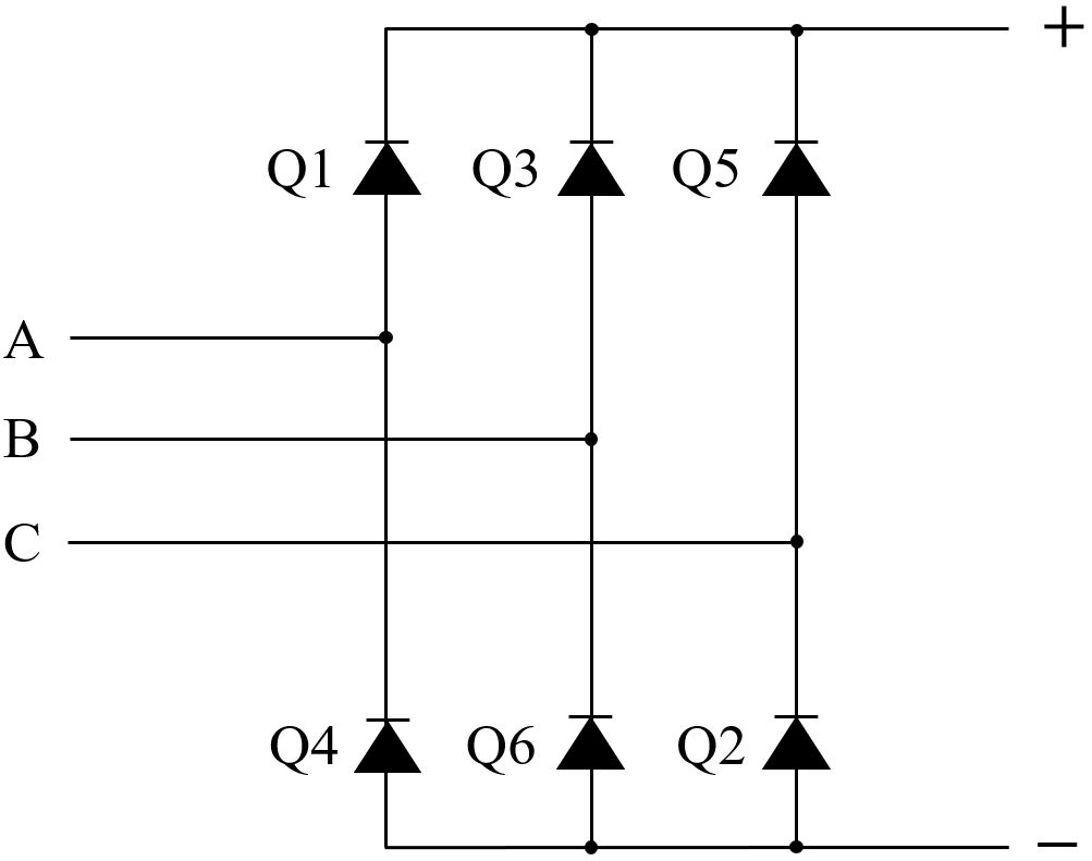 donde, el subíndice d hace referencia el eje directo, el subíndice q hace referencia el eje de cuadratura, L es la inductancia i, es la corriente, v es el voltaje, R es la resistencia del devanado de estator, ωm es la velocidad angular del rotor, p es el número de pares de polos y Te es el torque eléctrico [20]. Dado que el generador entrega una señal en AC, se emplea un convertidor que comprende seis diodos de alimentación conectados en una configuración de puente, empleando elementos de electrónica de potencia naturalmente conmutados como se indica en la Figura 4.