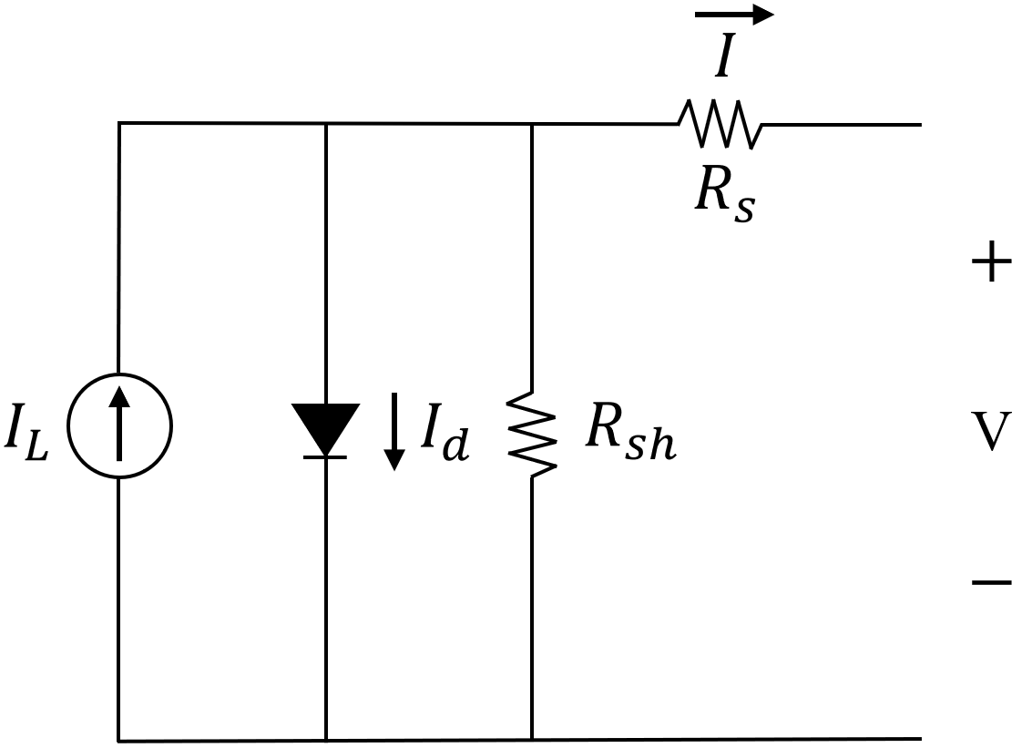 Para el módulo fotovoltaico se emplea un conjunto de paneles solares conectados en paralelo, los cuales emplean el modelo de la Figura 5, en la cual IL. es una fuente de corriente generada por luz, I. es la corriente del diodo, Rsh es la resistencia shunt y R. es la resistencia serie [20].