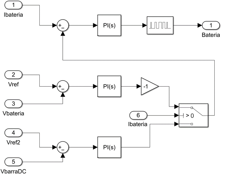 El CBC que se plantea utilizar en la microrred DC realiza una acción de control sobre el estado de carga y descarga de la batería para mejorar el desempeño de la microrred. Mide las variables de la batería y de la barra DC para controlar el estado de carga y descarga de la batería por medio de controladores PI. El diagrama del control implementado se puede verificar en la Figura 6.