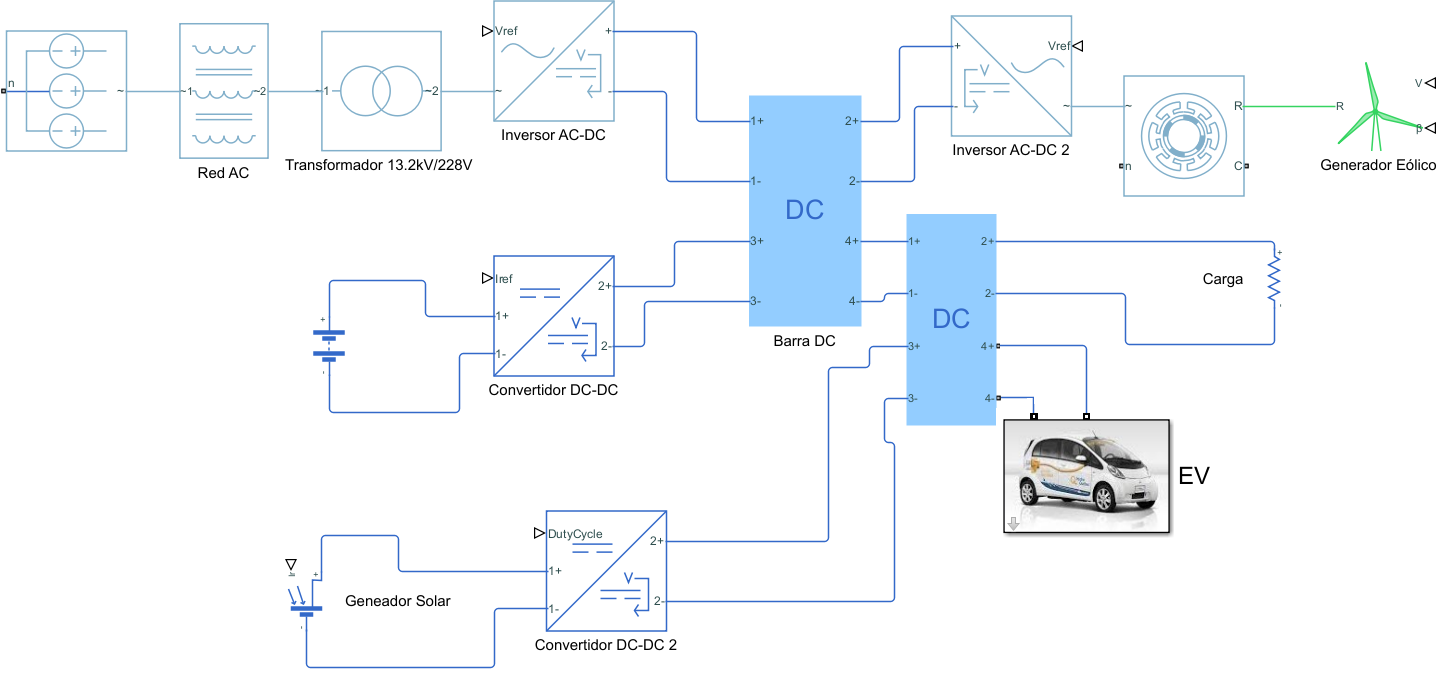 Este proyecto considera más componentes que los proyectos tomados como referencia, principalmente porque tiene en cuenta el modelo de vehículo eléctrico detallado, lo cual permite que las simulaciones cuenten con mayor precisión y por lo tanto muestren un comportamiento más cercano al real de la microrred DC.