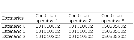En la Tabla 5 se muestran unos ejemplos de la nomenclatura de 3 condiciones operativas para cada escenario de incorporación de vehículos eléctricos. Para el escenario 0, condición operativa 1, la codificación que se presenta en la Tabla 5 indica que la red externa, la planta solar y la planta eólica estuvieron conectadas durante los 10 segundos de la simulación, además se consideraron 0 vehículos eléctricos y una carga resistiva de 2 ohms. Para los escenarios 1 y 2, condición operativa 1, se tienen las mismas condiciones que en el escenario 0, pero se considera 1 y 2 vehículos respectivamente. Para el escenario 0, condición operativa 2, la codificación que presenta la Tabla 5, hace referencia a que la red externa estuvo desconectada durante toda la simulación y la planta de generación solar y eólica estuvieron activadas los 10 segundos de la simulación, considerando 0 vehículos en la red y 2 ohms de carga resistiva. Para los escenarios 1 y 2, condición operativa 2, se tienen las mismas condiciones que en el escenario 0, pero se considera 1 y 2 vehículos respectivamente. Para el escenario 0, condición operativa 3, la codificación que presenta la Tabla 5, hace referencia a que la red externa, la planta de generación solar y eólica estuvieron activadas 5 segundos de la simulación, considerando 0 vehículos en la red y 2 ohms de carga resistiva. Para el escenario 1 y 2, condición operativa 3, se tienen las mismas condiciones que en el escenario 0, pero se considera 1 y 2 vehículos respectivamente.