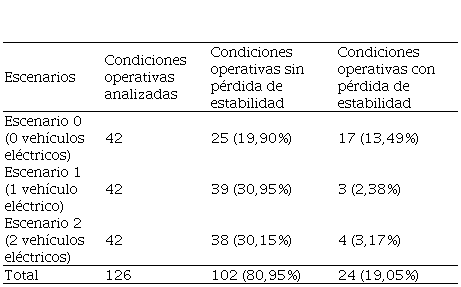 De las 126 condiciones operativas de la microrred analizadas, se identificaron ciertos escenarios en los que la operación de la microrred encuentra problemas. En el caso del escenario 0 se analizaron 42 condiciones operativas; en 25 de ellas, lo que equivale al l9,8 % de las condiciones operativas evaluadas, la microrred funcionó adecuadamente mientras que en 17 enfrentó dificultades, lo que equivale al 13,49 %. En el escenario 1, también se consideraron 42 condiciones operativas; en 39 de ellas, lo que equivale al 30,95 %, la microrred operó sin problemas mientras que en 3 tuvo dificultades, lo que equivale al 2,38 %. Por último, en el escenario 2, de las 42 condiciones evaluadas, en 38 la microrred operó sin inconvenientes, lo que representa el 30,15 % y en 4 presentó dificultades, lo que equivale el 3,17 %. En total, 80,96 % de las condiciones operativas la microrred operó de manera adecuada y en 19,04 % operó de con problemas.