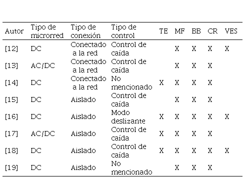 El comportamiento dinámico de las microrredes DC ha sido evaluado en diversas referencias. En [12], el autor presenta un modelo para estabilidad de pequeña señal en microrredes DC con vehículos eléctricos, encontrando que los valores propios complejos son fuertemente influenciados por los efectos inductivos y capacitivos de la red. En [13], los autores proponen un modelo dinámico para una microrred AC/DC híbrida e investigan la estabilidad de tensión de esta microrred para diferentes escenarios de fallas. En [14], los autores analizan una microrred DC aislada que integra turbinas eólicas y paneles fotovoltaicos, tomando como foco de la investigación el impacto del algoritmo seguidor de punto de máxima potencia sobre las variables de potencia entregada a la microrred y el perfil de tensión. En [15], los autores estudian la estabilidad de una microrred DC a través de un análisis de Lyapunov y empleando diferentes tipos de convertidores. En [16], los autores implementan un control de modo deslizante para un sistema híbrido, donde los parámetros se entrenan a través de una red neuronal artificial. En [17], los autores presentan el control activo de rechazo de perturbaciones en una microrred AC/DC, manteniendo el voltaje DC, la frecuencia y el flujo de potencia. En [18], los autores abordan la estabilidad estacionaria de microrredes DC de baja inercia, estableciendo límites de carga. En [19], los autores investigan la estabilidad y robustez de una microrred DC empleando diferentes tipos de cargas incluyendo potencia constante, impedancia constante y corriente constante. En la Tabla 1 se muestra el resumen indicando las características de las microrredes empleadas como caso de estudio en las anteriores referencias.