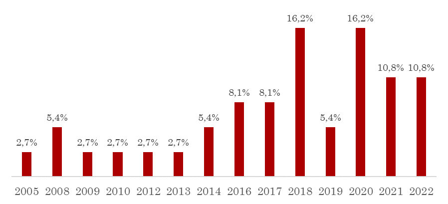 En cuanto a la frecuencia de publicación de los artículos se encontró que, entre el 2018 y 2022 un 59.4 % de los estudios abordan métricas de evaluación de factores de productividad en ASD (ver Figura 6).