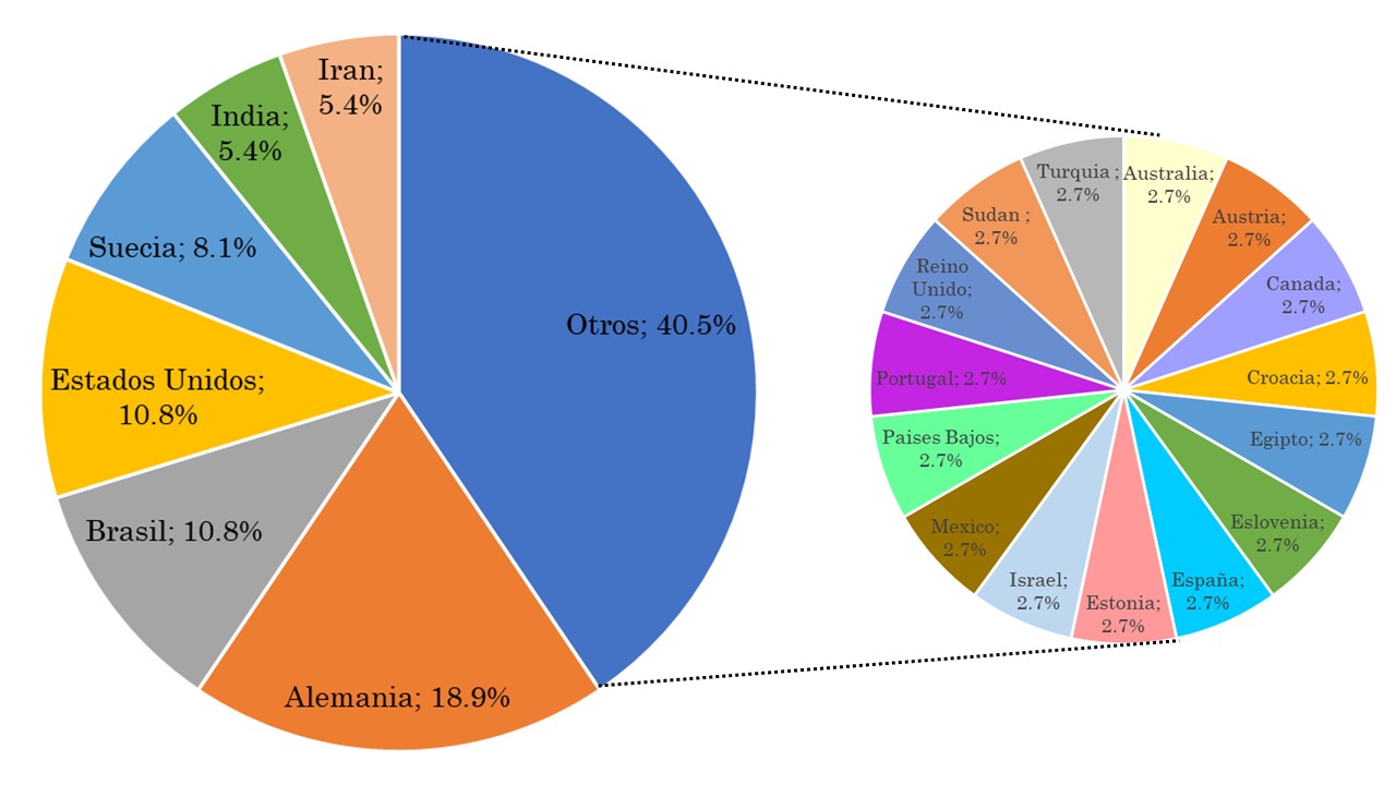 Otro aspecto para tener en cuenta fue la localización geográfica de los autores de los documentos analizados, con el objetivo de determinar el origen de los estudios por país de manera proporcional. La distribución de los países de procedencia de los artículos revisados se muestra en la Figura 7.
