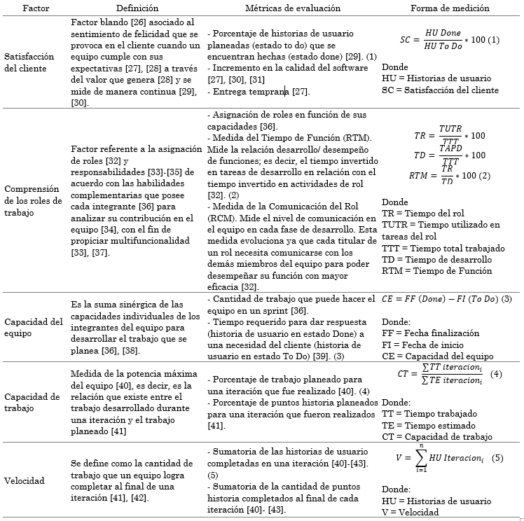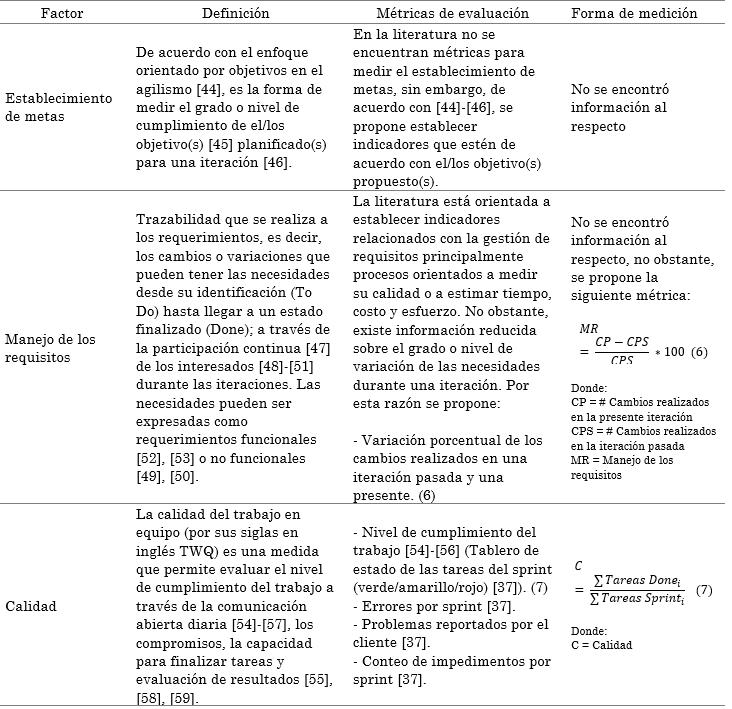 A través de estos estudios, se ha avanzado y aportado en la comprensión de los factores, identificado métricas para su evaluación y una aproximación de formalización matemática para algunas de esas métricas. Sin embargo, se observó que la literatura no aporta información en cuanto a métricas disponibles sobre factores como el establecimiento de metas y el manejo de requisitos. Por lo tanto, en esta investigación fue necesario proponer algunos elementos que podrían ser considerados en su medición.