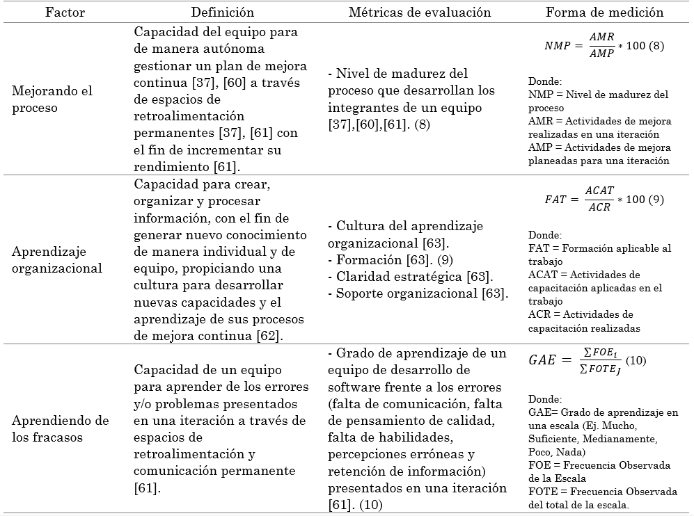 Durante la identificación de métricas, se encontró que factores como la velocidad, la capacidad de trabajo y la capacidad del equipo proporcionan métricas de medición centradas principalmente en el trabajo desarrollado por los integrantes del equipo. Por otro lado, factores como el aprendizaje organizacional y el aprendizaje de los fracasos están más orientados a situaciones que involucran el entorno y la organización en su conjunto.