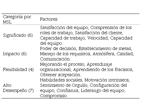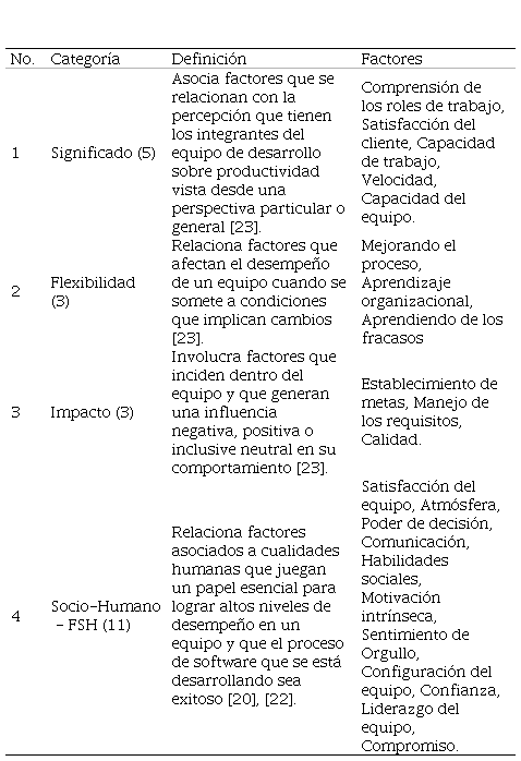 Posteriormente, el trabajo [15] considera los aportes generados por las autoras Machuca y Gasca [20] para establecer que el 52.17 % de los 23 factores están relacionados con aspectos socio-humanos. Lo anterior generó una reorganización de los mismos, la fusión de dos factores, además de renombrar la categoría 'alto desempeño' por 'socio-humano', considerando que esta incluiría factores relacionados con cualidades humanas [15]. Finalmente, los autores concluyen que solo 22 factores son fundamentales en la medición de productividad [15]. La Tabla 2 sintetiza una descripción de cada una de las categorías con sus respectivos factores.