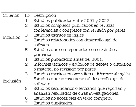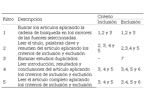 Para efectuar la búsqueda se consideraron los criterios de inclusión y exclusión descritos en la Tabla 3 y los filtros definidos en la Tabla 4.