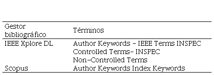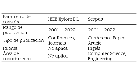 Las bases de datos bibliográficas seleccionadas para la búsqueda fueron IEEE Xplore DL y Scopus. Para lograr dicho propósito, se ejecutó la cadena de consulta para cada uno de los factores y se consideró algunos parámetros que se evidencian en la Tabla 5 (filtro 1).