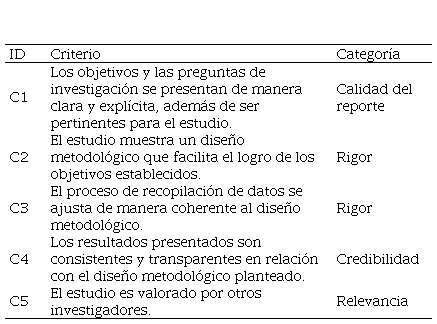 Después del proceso de selección, se realiza una tarea adicional vinculada a garantizar la calidad de los artículos localizados, que implica examinar una serie de criterios que se detallan en la Tabla 7.