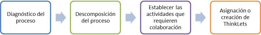 Además de los hallazgos obtenidos en este estudio, se sugiere explorar la viabilidad de implementar elementos de la ingeniería de la colaboración como patrones de colaboración y ThinkLets, que representan una oportunidad para soportar el proceso de aplicación en actividades de carácter colaborativo con el fin de mejorar la colaboración en equipos adoptantes de Scrum. Lo anterior, se puede realizar con la metodología proporcionada por [16] la cual está compuesta por 4 fases. En la primera, se realiza un diagnóstico del proceso, técnica o tarea; en la segunda, se realiza la descomposición del proceso; en la tercera se establecen las actividades que requieren colaboración, y en la última, se realiza la asignación o creación de ThinkLets (ver Figura 1).