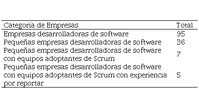 Al realizar este estudio en el departamento del Cauca, se identificaron 95 empresas dedicadas al desarrollo de software, de las cuales 36 son pequeñas empresas especializadas en este campo. Tras establecer contacto con estas empresas, se constató que únicamente 7 de ellas están en proceso de adopción de Scrum, y de ese grupo, 3 están actualmente en etapas de capacitación y aún no cuentan con experiencia reportada. Por lo tanto, solo 4 empresas resultan aptas para ser objeto de estudio. Sin embargo, es relevante destacar que únicamente 3 de estas empresas expresaron interés en participar en este estudio y compartir sus experiencias en relación con la implementación de Scrum (ver Tabla 1).