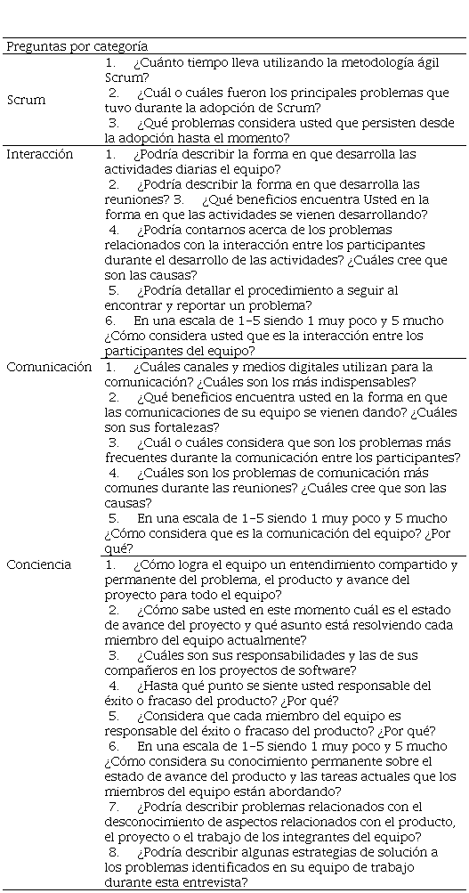 El cuestionario de esta entrevista semiestructurada fue aplicado a dos expertos que participaron como jueces en la validación de contenido y expusieron su opinión, lo cual permitió refinar las preguntas con el fin de obtener la información más relevante para este estudio. La entrevista consistió en 22 preguntas (ver Tabla 2), divididas en cuatro categorías: Scrum (3 preguntas), interacción (6 preguntas), comunicación (5 preguntas) y conciencia (8 preguntas).