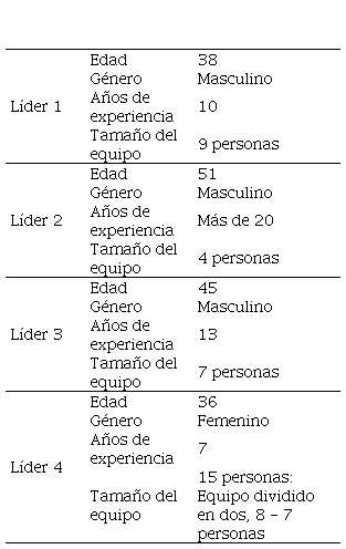En cuanto al género de los participantes, se puede destacar que a pesar de que el estudio incluyó a una participante mujer, dicha participante es líder de un equipo más grande (15 personas) y tiende a comportarse como dos equipos (8 y 7 personas).