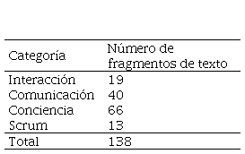 Una vez integrada la información de las entrevistas en la herramienta, se generaron cuatro categorías de análisis (Interacción, Comunicación, Conciencia y Scrum) que generan una linealidad entre los objetivos de este artículo y el análisis de resultados. A continuación, se describen las categorías utilizadas en este trabajo: