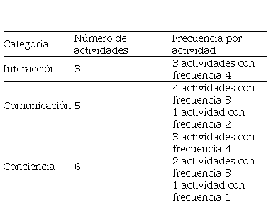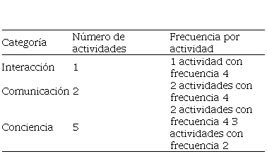 A continuación, se presenta el número de actividades obtenido en cada categoría y el número de actividades por frecuencia (ver Tabla 5 y Tabla 6).