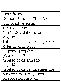 La Tabla 7 contiene la estructura de un ThinkLet, esta estructura fue obtenida con base en los ThinkLets existentes, con el fin de proporcionar una comprensión más clara de cuándo y cómo pueden ser utilizados.