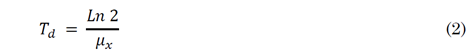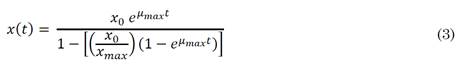 Where x corresponds to CFU/mL, t is the time in hours and x0 CFU/mL at time 0, Td is the doubling time, Ln 2 corresponds to the natural logarithm of 2 and µx is the specific growth rate. The logistic model was used to estimate the kinetic parameter, maximum growth rate (µmax ) for each of the evaluated strains, according to equation (3).