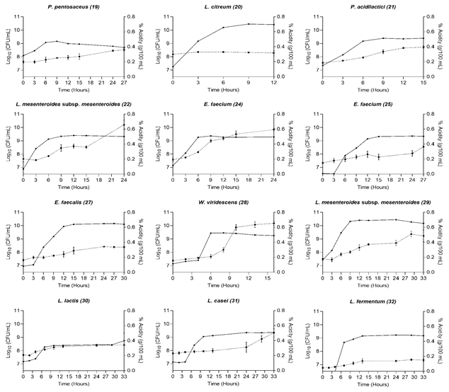 Enterococcus is one of the most abundant genera within the natural microbiota of milk; may play an important role in the development of aromas of fermented products such as cheese [30]. In this study, the strains E. faecium (25) and E. faecalis (27) presented adaptation phases higher than 4 hours, according to what was indicated in other reports [31]. E. faecium (24) presented a shorter adaptation phase, indicating that the growth of these microorganisms is variable between strains and related to their adaptation to the substrate [30]. Finally, Weissella viridescens (28) presented an adaptation phase of close to 4 h and a short exponential phase of 4-8 h, findings that agree with other studies [32] and corroborate its good behavior in milk.