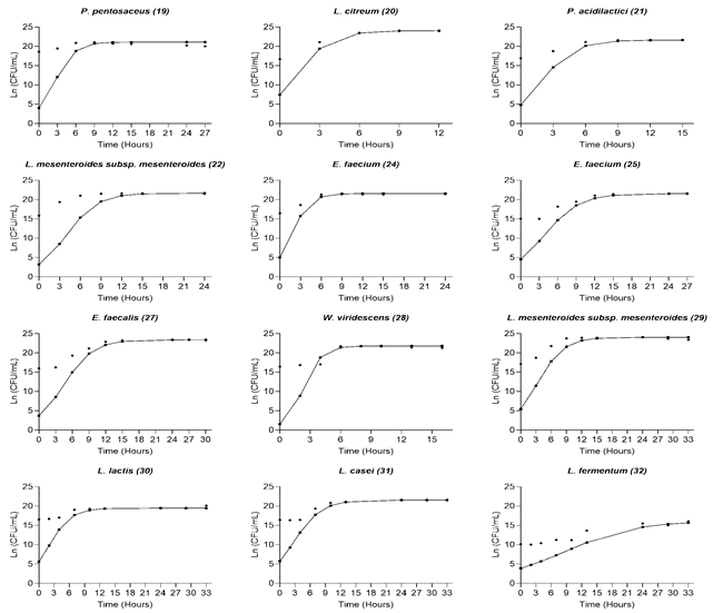 P. acidilactici (21) and Leu. mesenteroides (22) had a rapid adaptation to UHT milk with lower pH values and high percentages of acidity, which shows their potential to be included in the native LAB starter culture. However, other strains such as W. viridescens (28) and E. faecium (24) that require more time to adapt to UHT milk were also able to reach acidity values lower than 5.1 in the same period (24 h). The logistic model was fitted to the experimental values of biomass for each strain. However, it is necessary to evaluate technological aptitude to validate the suitability of these strains as a starter culture.