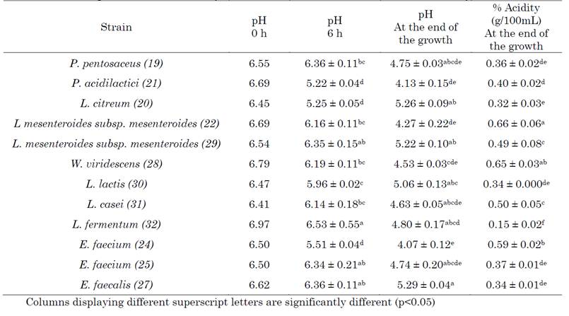 P. acidilactici has been reported as a strain that produces acidity from the fermentation of sugars, in addition to presenting coagulant activity, qualities that have suggested it as a representative of starter cultures [36]. On the other hand, it has been described that enterococci show a low or medium capacity to reduce the pH of milk, with some exceptions such as E. faecium, which has been shown to have a good acidification capacity in dairy matrices [37], which coincided with what was observed in this work. Other enterococci strains E. faecalis (27) and E. faecium (25) showed a lower reduction, both at 6 h and at the end of the kinetics. The pH for the Leuconostoc strains (20-22-29) at the end of the growth kinetics stabilized in a range between 4.27 and 5.26, data that corresponds to other reports for this bacterial genus [35], in which it is described that Leuconostoc strains, derived from dairy products, adapt very well to acidic environments. However, L. citreum, which in the first 6 hours showed a significant drop in pH, failed to pass the threshold of 5.1 at the end of the kinetics, which could be explained by the presence of organic acids in the medium that can have an inhibitory effect on the growth of Leuconostoc and cause an early entry into the stationary phase [25], [38].