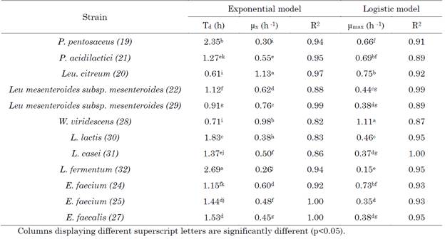 Abstract: Currently, there is a permanent search for native Lactic Acid Bacteria (LAB) to explore and apply their biodiversity in the development and improvement of industrial processes, with studies of growth kinetics and performance factors being a fundamental tool for biotechnological use. The objective of this study was to determine the kinetic parameters of 12 autochthonous strains (Pediococcus pentosaceus (19), Leuconostoc citreum (20), Pediococcus acidilactici (21), Leuconostoc mesenteroides subsp. Mesenteroides (22, 29), Enterococcus faecium (24, 25), Enterococcus faecalis (27), Weissella viridescens (28), Lactococcus lactis (30), Lacticaseibacillus casei (31) and Limosilactobacillus fermentum (32)) isolated from a traditional Colombian cheese Double Cream Cheese to obtain information that allows establishing the ideal conditions of the inoculum, standardizing the production of metabolites and exploring their use as starter cultures. Fermentation was carried out in UHT milk at 120 rpm and 35-37 °C until stationary phase, and samples were taken over time to determine pH and titratable acidity (TTA). Exponential and logistic models were used to fit the growth kinetics data. Validation of both models was carried out with the coefficient of determination R2, obtaining good consistency for both (R2= 0.925 - R2= 0.932), with slight variations in the kinetic parameters in all the strains. The genera Pediococcus, Leuconostoc, Lactococcus, and E. faecium (24) had the shortest adaptation phases (0-2 h), being P. acidilactici (21), Leu. mesenteroides (22), W. viridescens (28), and E. faecium (24) presented the lowest pH values and high acidity percentages, which shows their potential to be included in the native LAB starter culture and for technology and suitability aptitude studies to produce double cream cheese using pasteurized milk without losing the qualities of the original product.