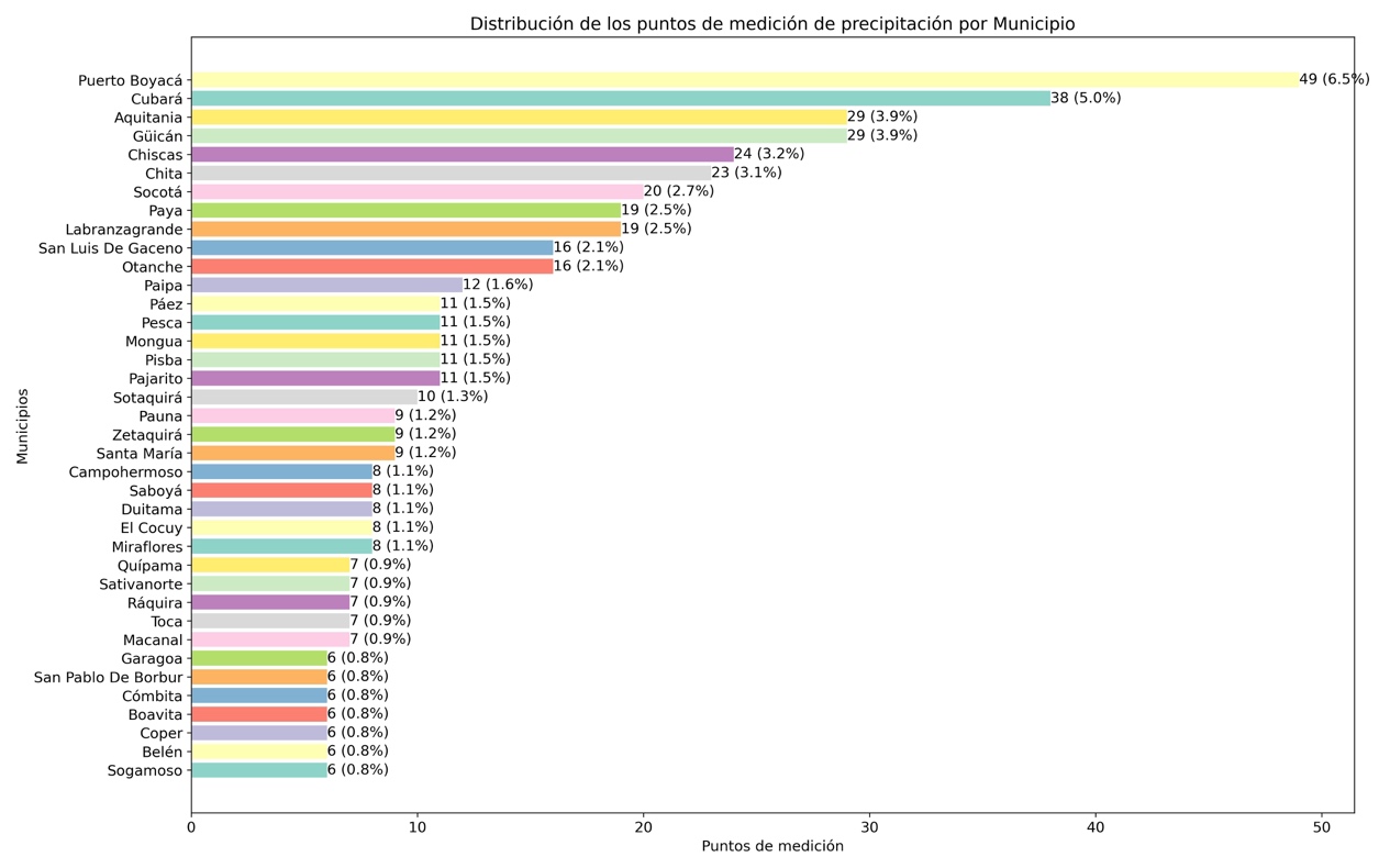 A partir del conjunto de datos, se calcula el porcentaje de estaciones de medición de precipitación, lo cual guarda una relación directa con el tamaño de cada municipio. En otras palabras, los municipios más extensos albergan una mayor cantidad de puntos de medición. De esta manera, se destaca que el municipio de Puerto Boyacá representa el 6,5 % del total de estaciones de medición, con 49 puntos de medición; seguido por Cubará y Aquitania en su orden, como se ilustra en la Figura 9.