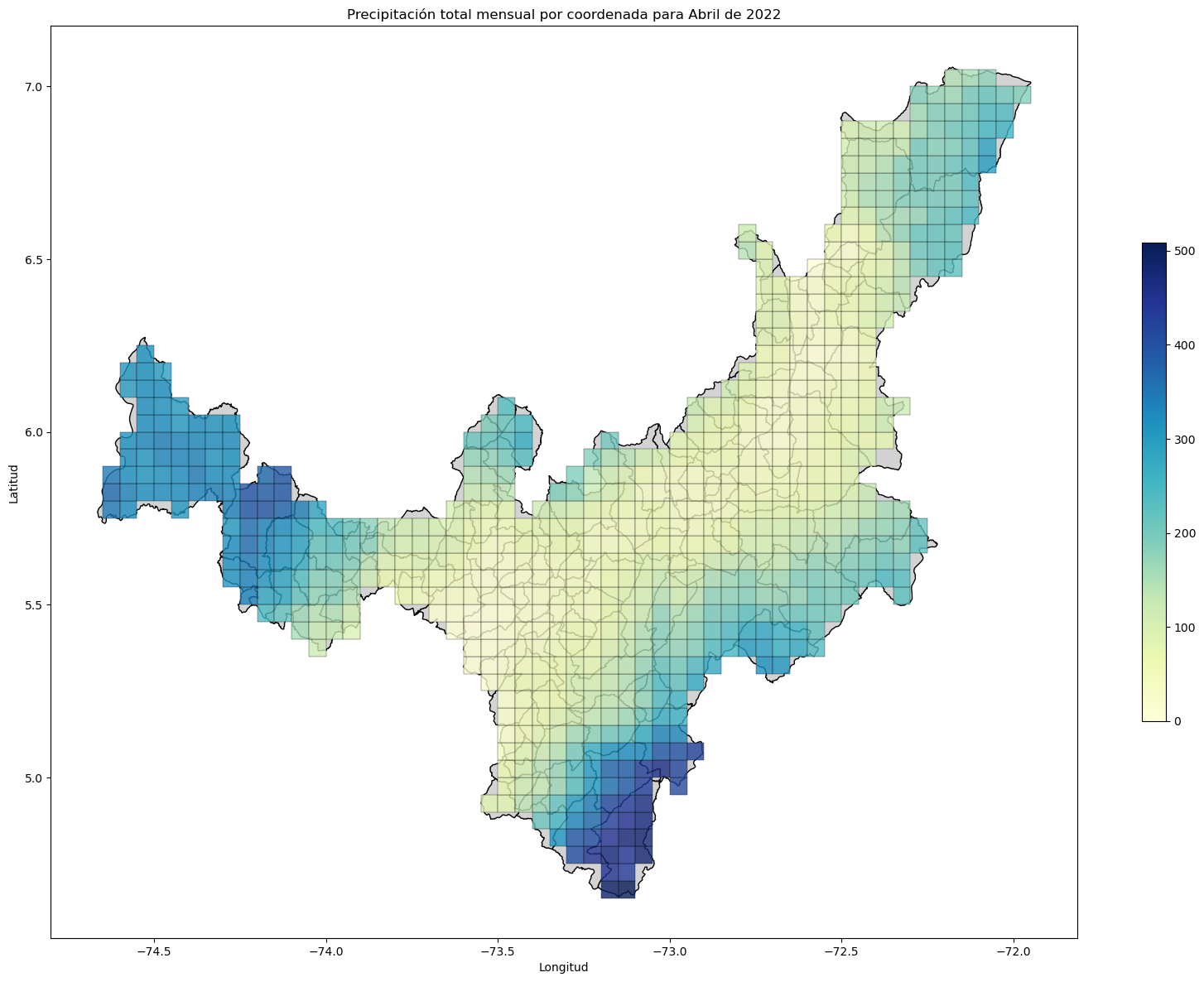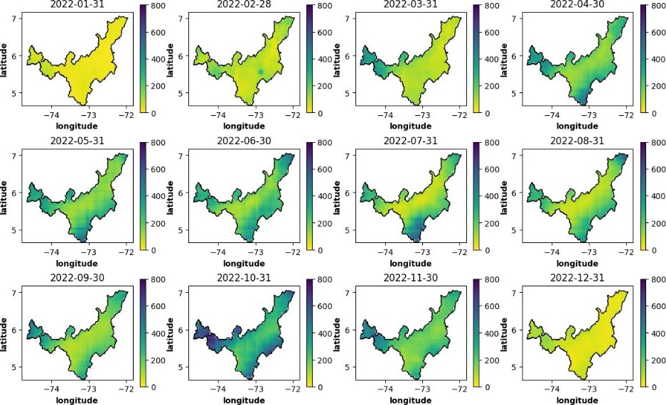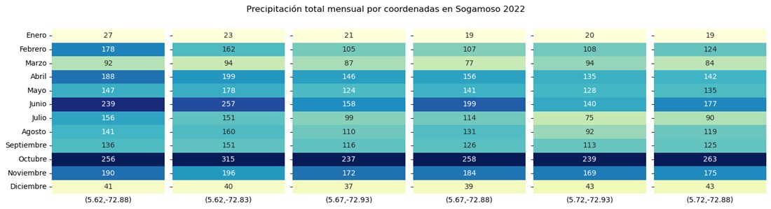 Por otro lado, la Figura 11 muestra la precipitación total mensual en cada punto dentro del municipio de Sogamoso durante el año 2022. Esta visualización proporciona información detallada sobre eventos específicos en un lugar particular, permitiendo conclusiones más precisas.