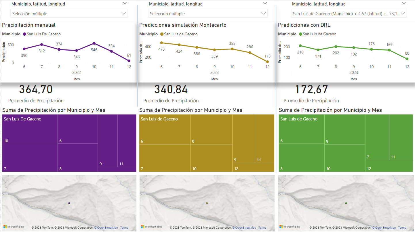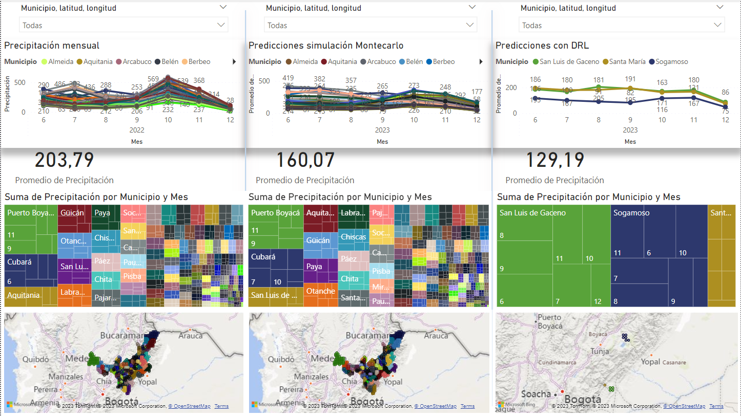Con el fin de ofrecer una representación visual enriquecedora y dinámica de los resultados obtenidos en el proyecto de predicción de precipitación mensual en el departamento de Boyacá, se ha creado un dashboard interactivo en Power BI. Este dashboard no solo proporciona una visión intuitiva de los datos reales históricos de precipitación, sino que también presenta las predicciones generadas por los modelos de simulación Montecarlo y aprendizaje reforzado profundo (DRL).
