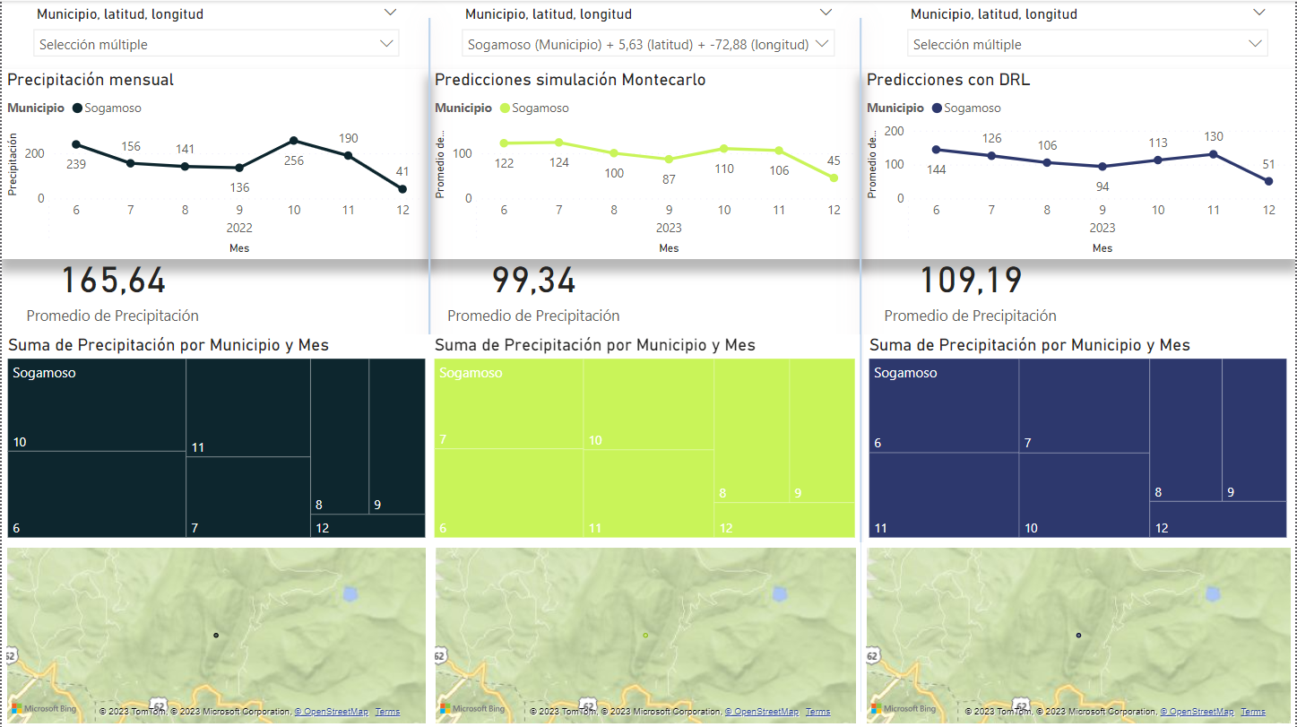 Aunque los modelos de Simulación Montecarlo y DRL ofrecen un enfoque innovador y efectivo para la predicción de precipitación mensual, no han superado la precisión y el rendimiento de los modelos convencionales basados en Aprendizaje Profundo con Redes Neuronales. Por lo tanto, se recomienda considerar estos últimos cuando la precisión en la predicción es de máxima importancia. Por otra parte, el desarrollo del tablero de control interactivo en Power BI ha demostrado ser altamente efectivo en el análisis de datos de precipitación en el departamento de Boyacá. Este tablero ofrece una representación visual dinámica de los datos climáticos y ha mejorado significativamente la comunicación de los resultados, así como la identificación de patrones y tendencias climáticas.