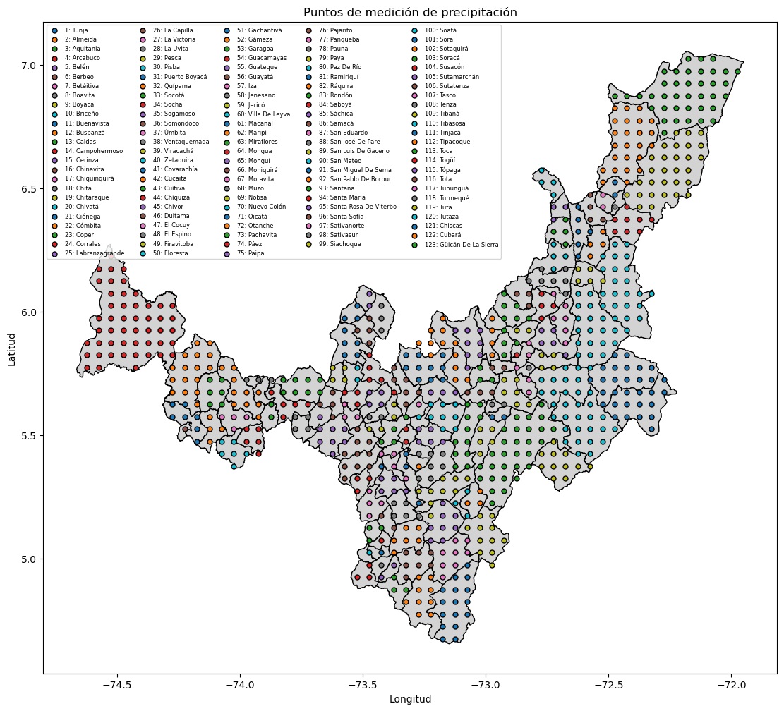 La agrupación por municipio se basa en etiquetas de municipios asignadas a cada conjunto de coordenadas de medición de precipitación, y luego se suman los valores de precipitación mensual correspondientes a esas coordenadas y periodos de tiempo específicos por lo que se usa como etiqueta para el píxel.